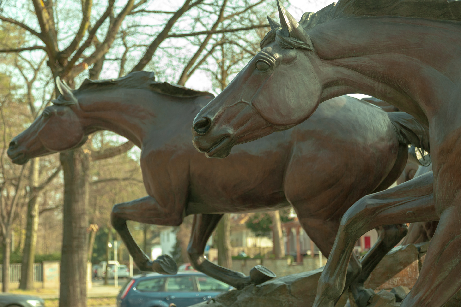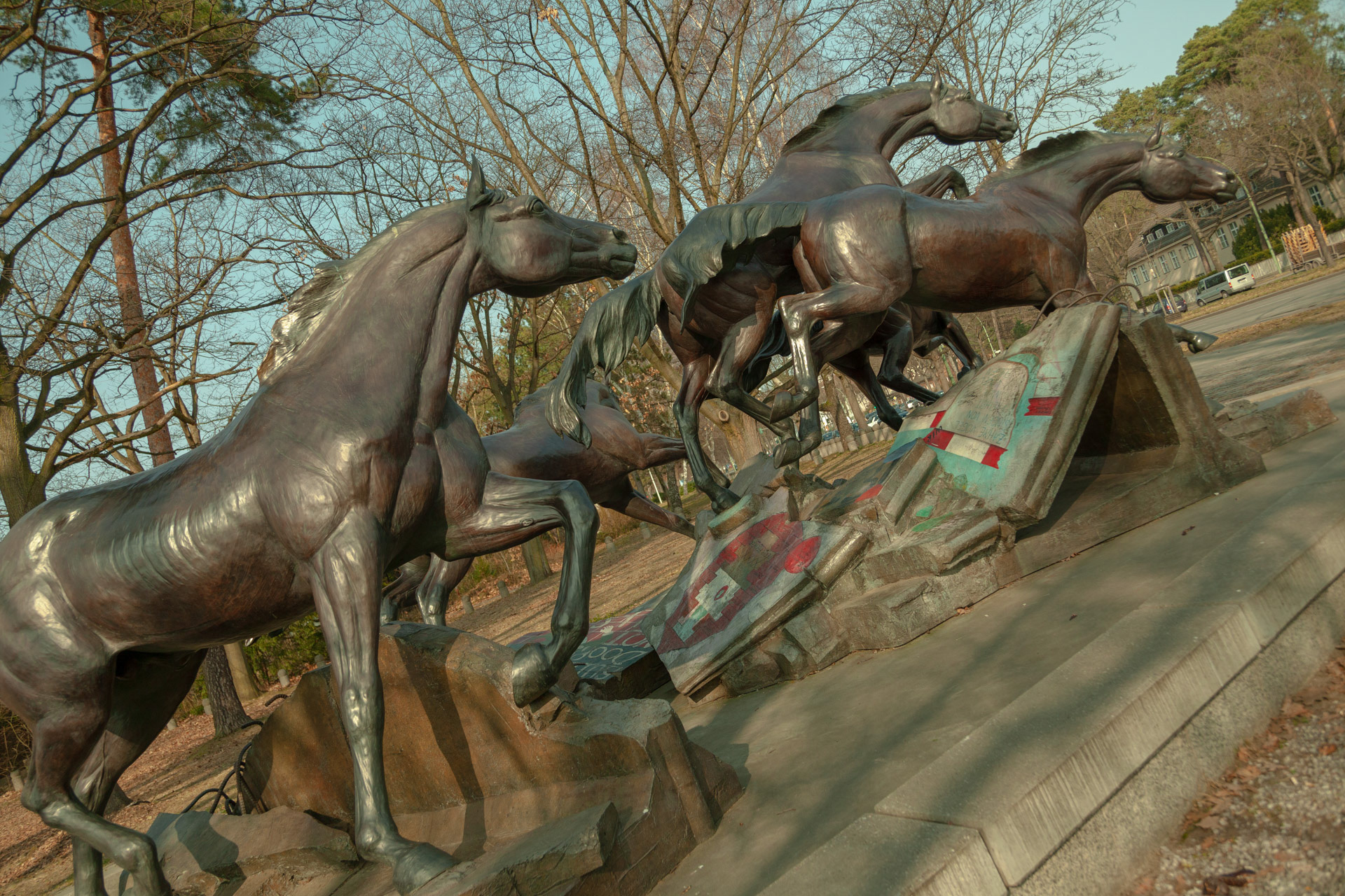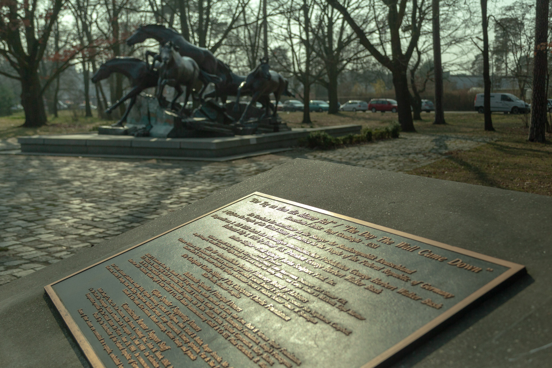 The Day the Wall Came Down are two sculptures by Veryl Goodnight honouring the end of the Berlin Wall. It depicts five horses leaping over actual pieces of the broken wall. One is in the USA, one is located near the Allied Museum in the former American sector of Berlin.
